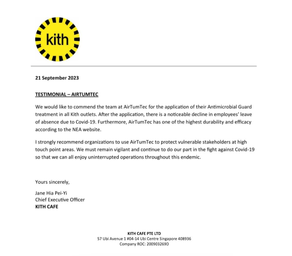We are also aware that the AirTumTec® product is the first and only spray-on coating solution that has passed through the stringent set of guidelines required by NEA. The comprehensive certifications presented on performance, durability, and safety according to NEA guidelines confidently demonstrated the sustained anti-microbial performance and safety of the AirTumTec® treatment in keeping our coaches, athletes, and officials safe."